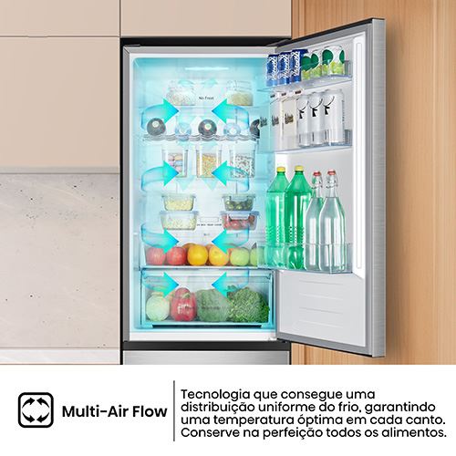 Com pequenos orifícios na parede traseira do equipamento, é mantida uma temperatura uniforme em todo o frigorífico, especialmente depois de a porta ser aberta. Ao arrefecer cada secção de cada compartimento ao mesmo tempo, ajuda a manter a sua comida fresca durante mais tempo.