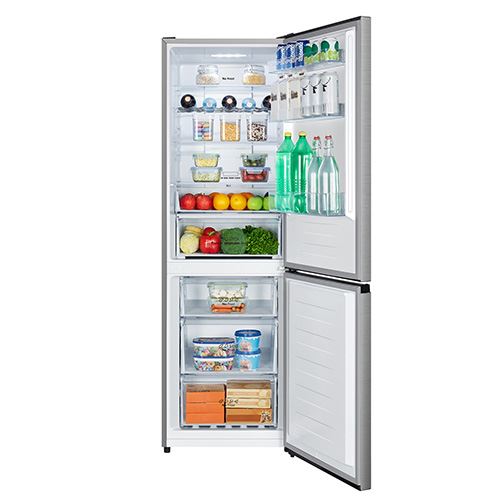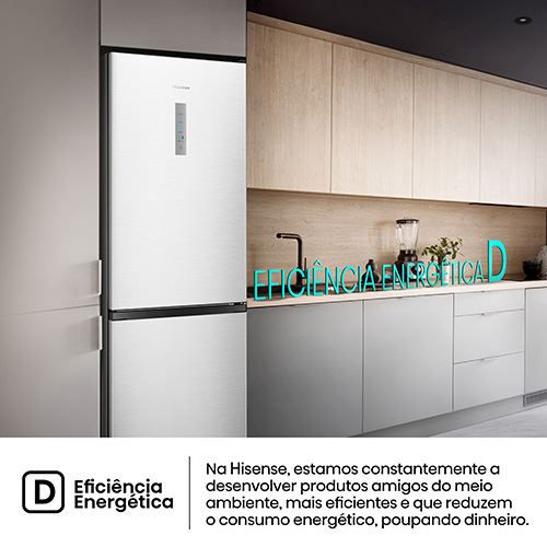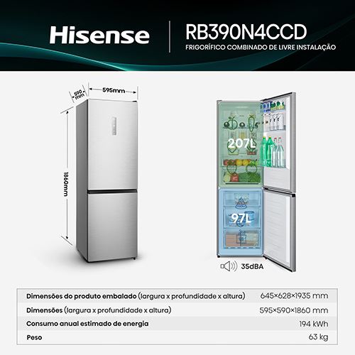 Frigorífico Combinado Hisense RB390N4CCD de 2 portas, com capacidade total de 304 Litros (Frigorífico 207 litros e congelador 97 litros). Tem uma capacidade de congelação de 6 kg em 24 horas, uma eficiência energética D e o consumo anual de 194 kWh.