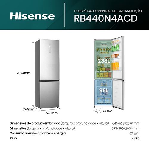 Frigorífico Combinado Hisense RB440N4ACD de 2 portas, com capacidade total de 336 Litros (Frigorífico 238 litros e congelador 98 litros). Tem uma capacidade de congelação de 6 kg em 24 horas, uma eficiência energética D e o consumo anual de 197 kWh.