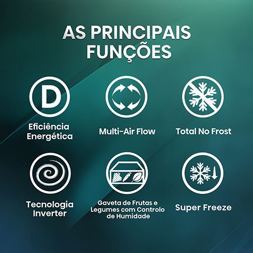 Função Super Freezing (Congelação rápida),Porta reversível, Pés Ajustáveis, Multi Air Flow, Alarme na porta