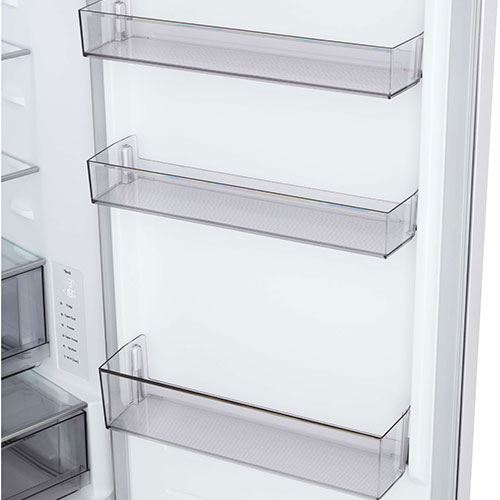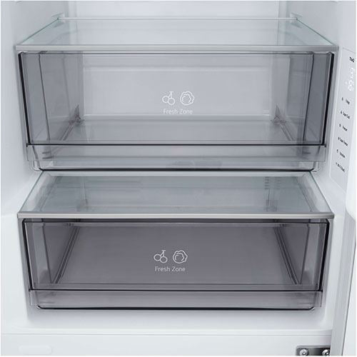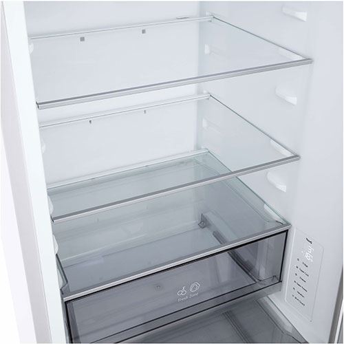 Inclui funcionalidades inteligentes como Wi-Fi ThinQ™ e Smart Diagnosis, permitindo controlo remoto e assistência técnica simplificada. Para maior comodidade, conta com Express Cool e Express Freeze, ideais para arrefecimento rápido. O interior é iluminado por LED e organizado com prateleiras em vidro temperado, gaveta Fresh Zone e Big Zone no congelador para artigos volumosos.