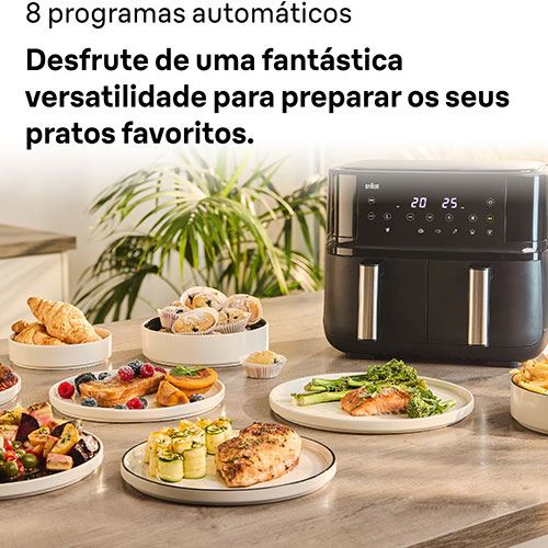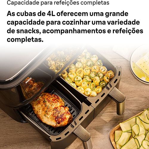 Outras Informações 2x Cubas com 4L de capacidade cada | Temperatura: 80 - 200 ºC | Visor Touch Digital | Tecnologia RealAir | Fast Coocking | Função Sync & Match (os alimentos das duas cubas ficam prontos ao mesmo tempo)