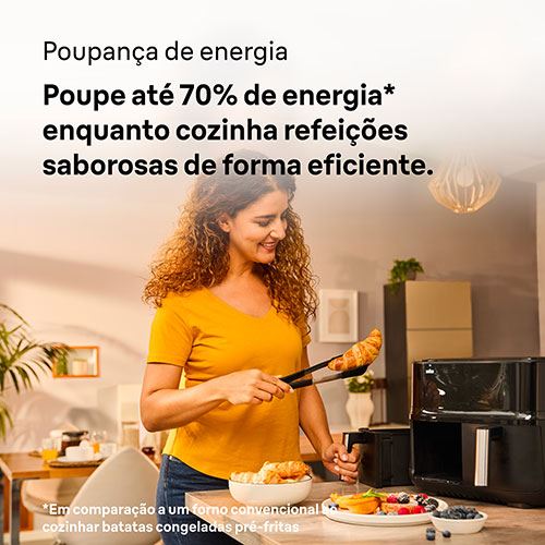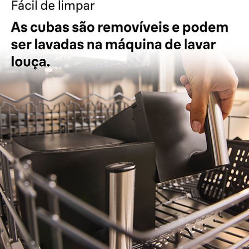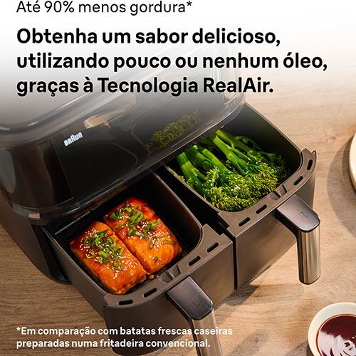 Diga adeus às preocupações com o tempo: basta pressionar o botão Sync e ambos os pratos terminam de cozinhar juntos. Uma forma saudável de cozinhar, usando até 90% menos gordura sem sacrificar o sabor ou a textura dos alimentos, graças à Tecnologia RealAir. E as gavetas próprias para lava-louças facilitam a limpeza.