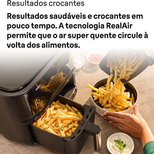 A tecnologia RealAir circula ar superaquecido em redor dos seus alimentos com um ventilador de alta velocidade. Para resultados saudáveis ??e crocantes e macios por dentrp, em pouco tempo.