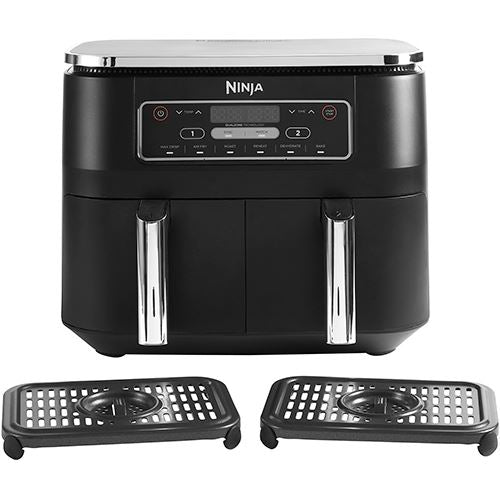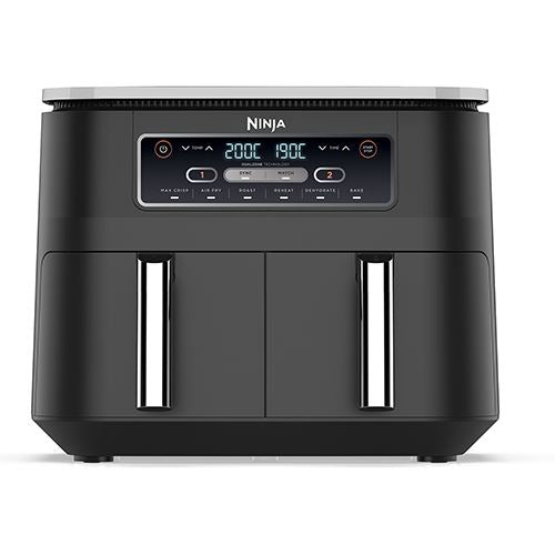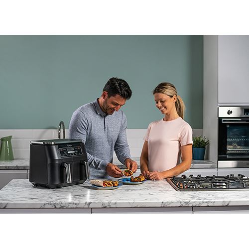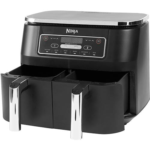 A fritadeira de ar 6 em 1 de 7,6 litros Dual Zone que cozinha 2 tipos de alimentos, ao mesmo tempo, de 2 maneiras diferentes e termina de cozinhar ao mesmo tempo para que nenhum deles esfrie. Precisa de cozinhar para mais pessoas? A função MATCH utiliza o mesmo programa de cocção em ambos os compartimentos para preparar o dobro da comida ao mesmo tempo. Cozinha só para si? Também pode cozinhar usando apenas um compartimento. Cada compartimento antiaderente de 3,8 litros tem capacidade para 1 kg de batatas fritas. Até 75% mais rápido do que os fornos elétricos, cria com rapidez e facilidade pratos deliciosos que farão as delícias de toda a família com estas 6 funções: Fritadeira de ar: até 75% menos de gordura do que com os métodos tradicionais para fritar. Max Crisp/gratinar: de congelado a crocante em apenas alguns minutos. Com uma temperatura de até 240°C pode cozinhar e dourar os seus ingredientes congelados favoritos, desde tiras de frango empanadas até batatas fritas. Assar: carne, peixe e legumes perfeitamente assados com acabamento dourado. Assar: prepare pastéis ou saboreie pães recém cozidos, tartes e sobremesas. Desidratar: crie snacks de fruta desidratada, como maçã, manga, banana ou abacaxi. Reaquecer: recupere os restos de comida dando-lhes um acabamento como se se tivesse acabado de fazer. O inovador ventilador autoajustável muda automaticamente as velocidades dependendo da função de cocção selecionada. Pode lavar-se facilmente graças às suas peças antiaderentes e aptas para lavar na máquina de lavar louça.