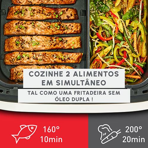 Utilize a zona Modo Familiar para cozinhar alimentos grandes e porções generosas para até 8 pessoas. Ou crie duas zonas e cozinhe ingredientes separados com controlos individuais de tempo e temperatura. Tal como uma fritadeira sem óleo dupla!