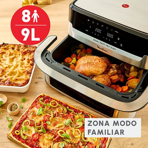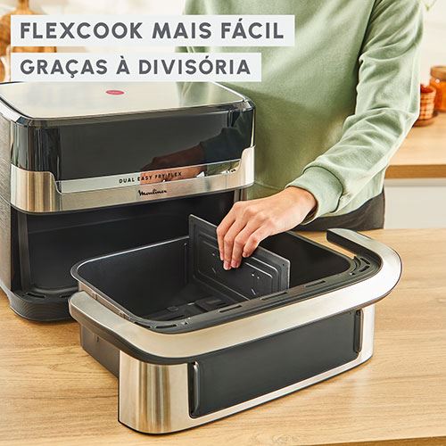 Com a Dual Easy Fry Flex, basta encaixar ou retirar a engenhosa divisória FlexCook e alternar entre 2 zonas de preparação (5,5 L + 3,5 L) para 1 única zona Modo Familar (9 L).