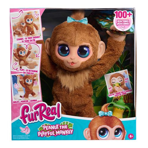 Descobre Peanut, o macaco interativo com mais de 150 sons e reações! Com 38 cm de altura e pelo de peluche macio, é perfeito para brincadeiras e miminhos. Peanut anda sozinho ou de mãos dadas, emite sons enquanto se move e reage a carinhos e ao biberão de banana. Um novo melhor amigo cheio de diversão interativa!