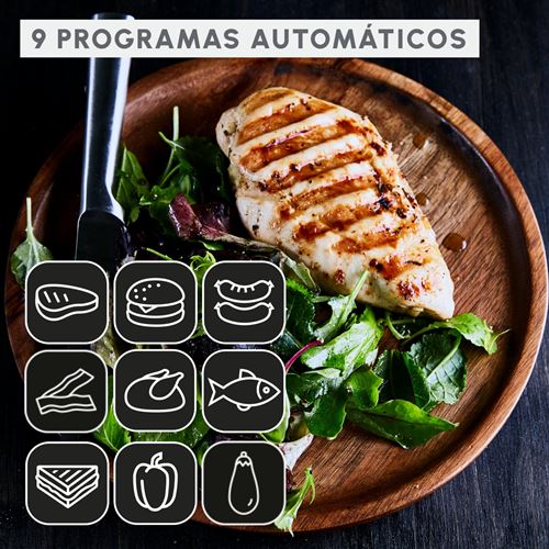 Sem necessidade de monitorização: Basta seguir o indicador do nível de cozedura com 6 programas automáticos: carne vermelha, hambúrgueres, salsichas, carnes brancas, peixe e sanduíches.