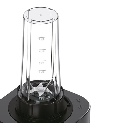 Capacidade de 2 L com o Jarro Multiserve para preparar várias porções de uma vez, capacidade de 0,7 L com o seu Jarro Pessoal para levar consigo e capacidade de 0,5 L para do Jarro Picador para cortar os seus materiais uniformemente. Todos os jarros são feitos de tritan, um material resistente, inodoro e durável.