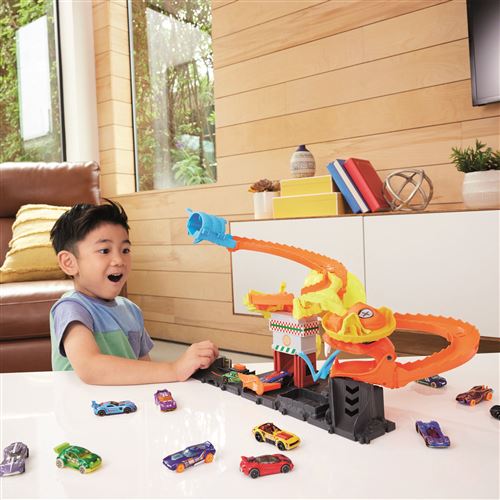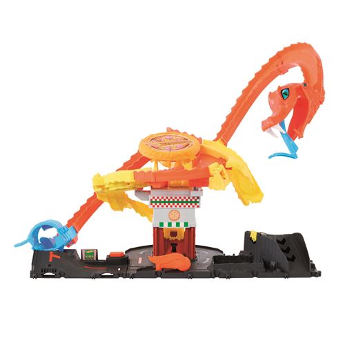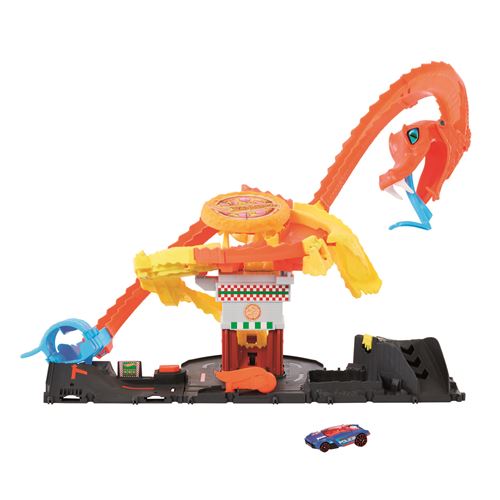 Conjunto de pistas de carro de brinquedo Hot Wheels City, Pizza Slam Cobra Attack, pista espiral de cauda de cobra com randomizador, 1 veículo em escala 1:64.