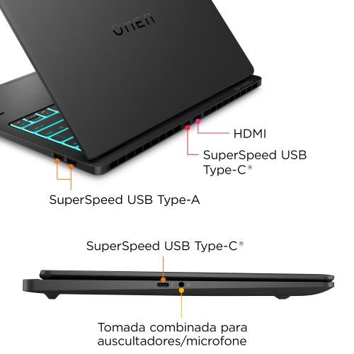 1x USB-C de 10 Gbps (USB Power Delivery, DisplayPort™ 1.4, HP Sleep and Charge) | 1x USB-A de 10 Gbps (HP Sleep and Charge) | 1x USB-A de 10 Gbps | 1x HDMI 2.1 | 1x combo auscultadores/microfone
