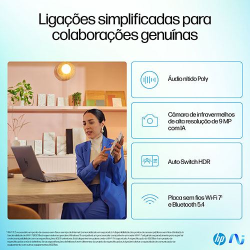 Ligue-se verdadeiramente com a câmara de 9 MP com IA, o Windows Studio Effects, o Wi-Fi 7 e a Poly Camera Pro.