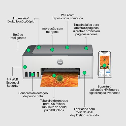 Configuração fácil guiada, a impressora diz-lhe o que fazer a seguir com os botões inteligentes. Ajuda a poupar energia com a Tecnologia HP Auto-On/Auto-Off. Imprima, digitalize e envie faxes em movimento a partir de qualquer dispositivo móvel com a aplicação HP Smart.