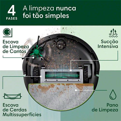 Outras Informações Aspiração: Escova híbrida de borracha e cerdas, Escova de cantos e rodapés | Lavagem: Mopa de microfibra, 2x lavagem mais intensa** com SmartScrub, Deteta e evita automaticamente tapetes no modo de lavagem | Capacidade da estação de limpeza 75 dias