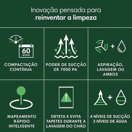 Outras Informações Aspiração: Escova híbrida de borracha e cerdas, Escova de cantos e rodapés | Sem esvaziar e sem auto - esvaziamento: DustCompactor comprime os detritos de sujidade no depósito do roobot, O primeiro depósito de compactação de sujidade integrado do mercado que retém detritos até 60 días de utilização