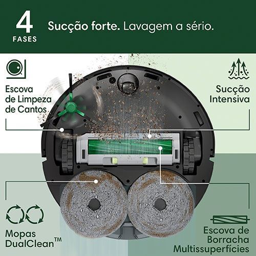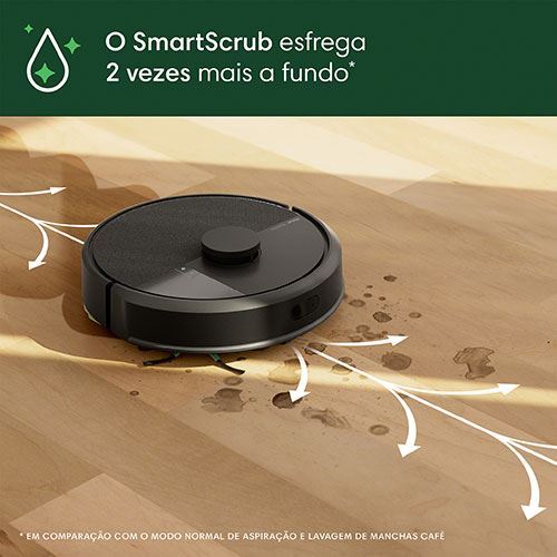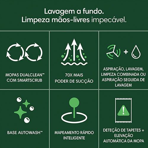 Aspiração: 70x mais poder de sucção, Escova híbrida de borracha e cerdas, Escova de cantos e rodapés | Lavagem: Esfregonas DualClean, 2x lavagem mais intensa** com SmartScrub, Evita molhar tapetes com elevação automática | Base multifunções: Esvaziamento automático de sujidade até 75 dias | Humidificação e lavagem das esfregonas | Secagem das esfregonas | Ciclos de auto-limpeza | Recarrega e retoma a limpeza | Capacidade da base multifunções: 75 dias