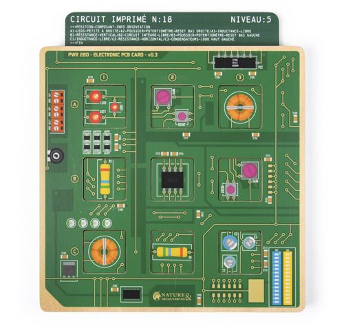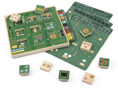 1 Circuito de Madeira | 12 Peões de Madeira componentes eletrônicos | 10 Cartas “Problema” | 1 Cartão Solução