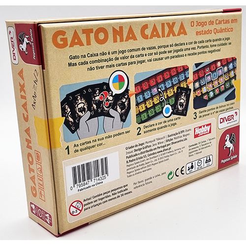 Gato na Caixa não é um jogo comum de vazas, porque só declara a cor de cada carta quando a joga. Mas cada combinação de valor da carta e cor só pode ser jogada uma vez. Portanto, tome cuidado: se não tiver mais cartas para jogar, vai causar um paradoxo e recebe pontos negativos!