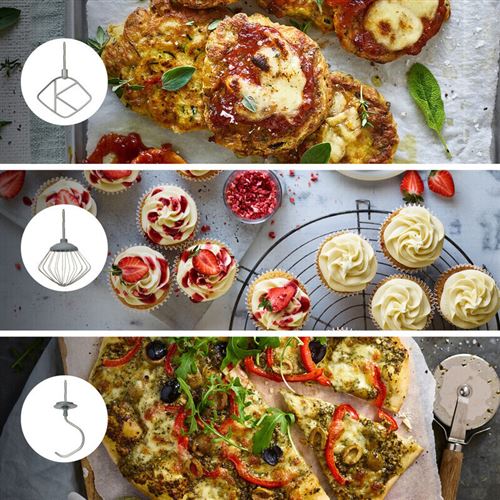Plástico, Aço inoxidável (batedor de pinha e gancho), Aluminio (batedor K)