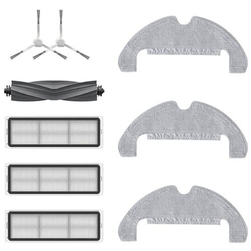 O conjunto é composto por 1 escova principal em nylon e microfibra, que remove sujidade e detritos de diferentes superfícies, 2 escovas laterais de 3 braços para alcançar cantos e bordas, 3 filtros de alta precisão que capturam partículas finas e evitam poluição secundária, e 3 panos de esfregona em microfibra para uma limpeza profunda de pisos duros.
