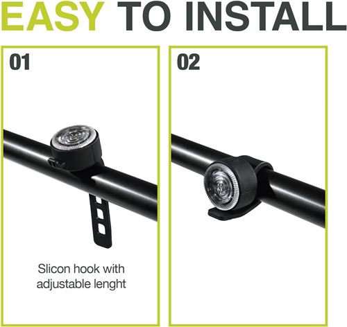 INSTALAÇÃO - Graças ao confortável sistema de fixação em silicone, o kit light é muito fácil de instalar e fixar no guidão. Seu sistema de fixação de comprimento ajustável permite que as luzes sejam colocadas em qualquer tipo de guidão ou quadro.