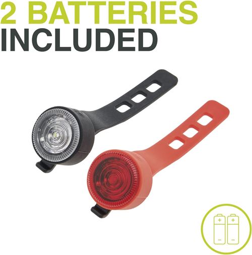 Kit de luzes LED dianteiras e traseiras para bicicleta e trotinete, funcionam com 2 baterias CR2032. Aumenta e melhora a visibilidade e segurança na estrada. As luzes estão equipadas com uma fixação de silicone universal e ajustável, pelo que são adequadas para qualquer tipo de guiador. As luzes oferecem 3 modos de iluminação: luz branca, luz vermelha e luz intermitente. Graças ao sistema de montagem/desmontagem rápida, as luzes são rápidas e fáceis de colocar e tirar.