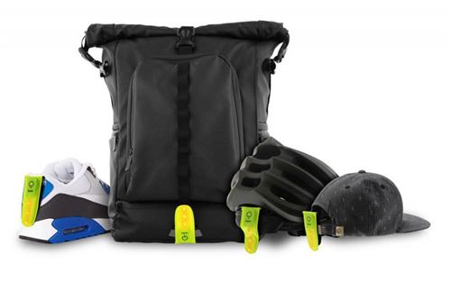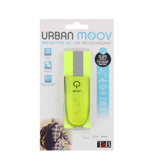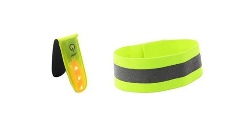 1 braçadeira reflexiva universal, 1 clipe de LED de flashing com 2 modos de flash (luz contínua + luz intermitente). Resistente à água e ao suor, o clipe é alimentado por baterias tipo botão CR2025H (incluídas).