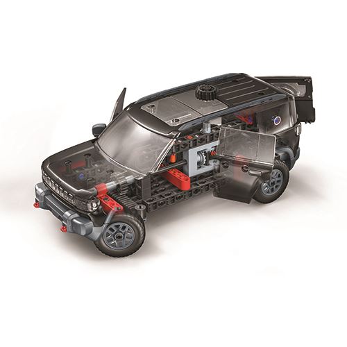 Um kit de construção com mais de 200 componentes para montar um modelo de veículo todo-o-terreno elétrico Jeep Recon e descobrir os conceitos de mecânica e engenharia. Design fiel ao modelo original com 5 portas e sistema de direção de cremalheira!
