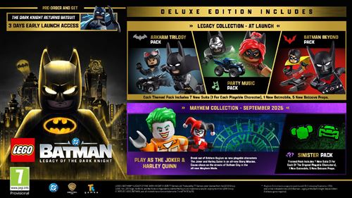 *A Coleção Mayhem é um DLC pós-lançamento separado, com lançamento previsto para setembro de 2026, e estará incluída na LEGO Batman: Legacy of the Dark Knight Deluxe Edition (é necessário o jogo base completo).