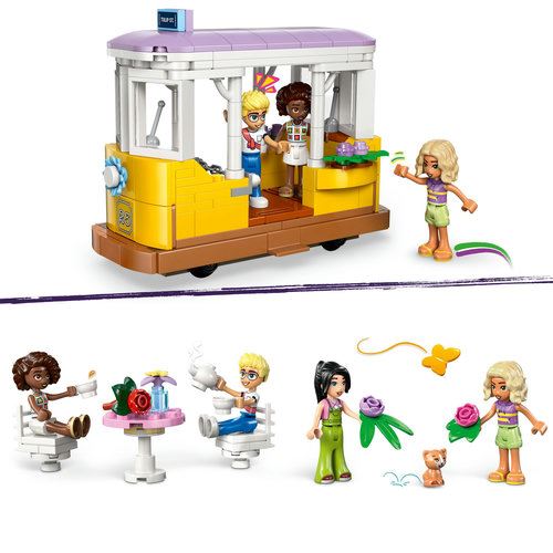 Descubra a abundância de flores e plantas deste set, que conta a história da Aliya, Olly, Nova, Esma e o gato Nugget, que gostam de se encontrar no café e loja de flores. O set está cheio de funções que inspiram histórias criativas. Inclui um adorável elétrico, um café com lugares no exterior e uma cozinha com frigorífico, forno e máquina de café. Existe ainda uma loja de flores com buquês e vasos à venda. Quando a brincadeira chega ao fim, as crianças expõem o modelo numa estante ou mesa e apreciam este modelo incrível dia após dia.