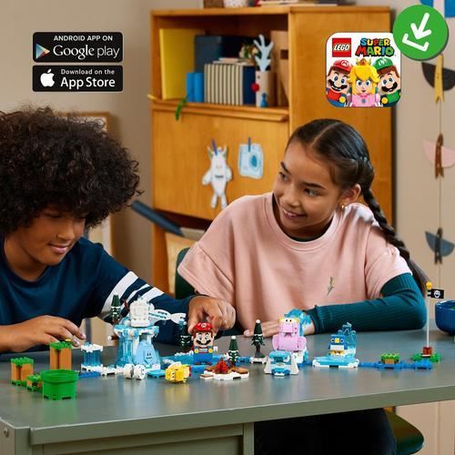As crianças podem adicionar um nível de gelo emocionante ao seu mundo LEGO Super Mario com o Set de Expansão A Aventura na Neve de Fliprus (71417), que inclui 4 personagens do Super Mario. Os jogadores ganham moedas digitais por ajudar a sua figura LEGO Mario, LEGO Luigi ou LEGO Peach (não incluídas) a derrotar um Tropa Koopa Vermelho, o Gelinho e um Fliprus, patine no «gelo», aqueça-se junto ao «fogo» e ofereça uma peça de fruta que estava escondida ao pinguim bebé como presente. (Nota: o Pack Inicial 71360, 71387 ou 71403 é necessário para brincar).