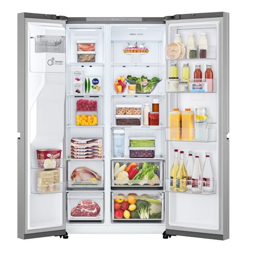 Frigorífico americano, prateado da LG. com capacidade total de 641 litros, em que 420 litros correspondem à capacidade de armazenamento do frigorífico e os restantes 221 litros à do congelador.