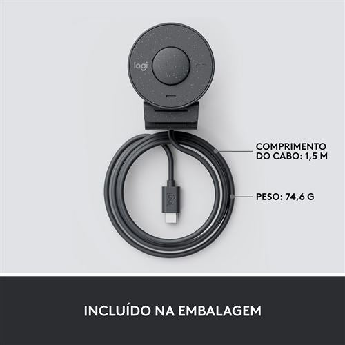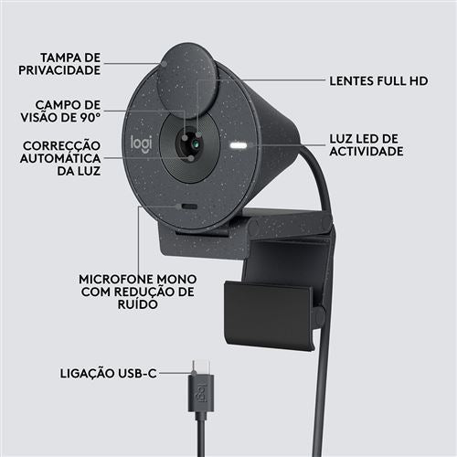Uma webcam de 1080p com correção automática de luz, microfone com redução de ruídos e conectividade USB-C.