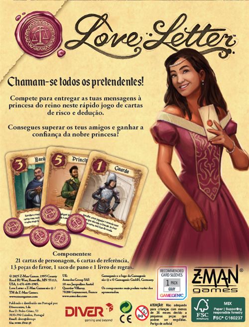 Em Love Letter Nova Edição, 2 a 6 pretendentes competem para que as suas mensagens sejam entregues à princesa, que procura o parceiro ideal e confidente para quando ela assumir o trono. Chamam-se todos os pretendentes! Compete para e entregar as tuas mensagens à princesa do reino neste rápido jogo de cartas de risco e dedução.