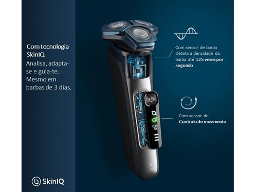 A Philips S7783/55 desliza suavemente sobre a sua pele cortando cada pelo rente, mesmo em barbas de 3 dias. Equipada com tecnologia SkinIQ avançada, a máquina de barbear detecta, adapta-se à densidade do pelo e orienta o movimento correcto, para um maior conforto da pele.
