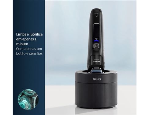 O potente sistema de limpeza limpa e lubrifica cuidadosamente a sua máquina de barbear em apenas 1 minuto, mantendo o seu melhor desempenho durante mais tempo. É o sistema de limpeza mais pequeno do mundo, para que possa guardá-lo facilmente e utilizá-lo em qualquer lugar.