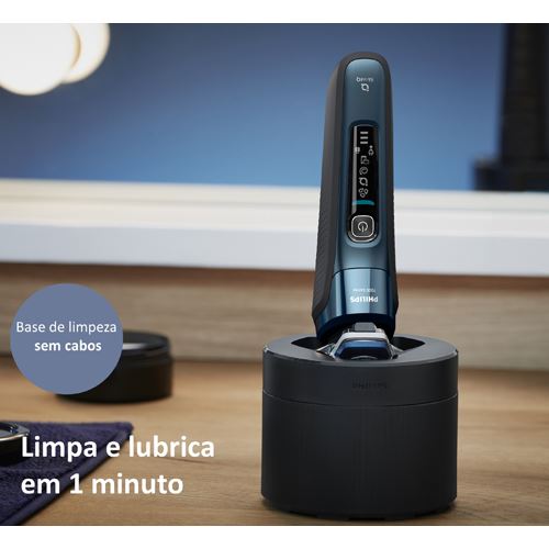 O potente sistema de limpeza limpa e lubrifica cuidadosamente a sua máquina de barbear em apenas 1 minuto, mantendo o seu melhor desempenho durante mais tempo. É 10 vezes mais eficaz do que a limpeza com água (Com base nos utilizadores da série S7000 e da aplicação GroomTribe da Philips em 2019). É o sistema de limpeza mais pequeno do mundo, para que possa guardá-lo facilmente e utilizá-lo em qualquer lugar.