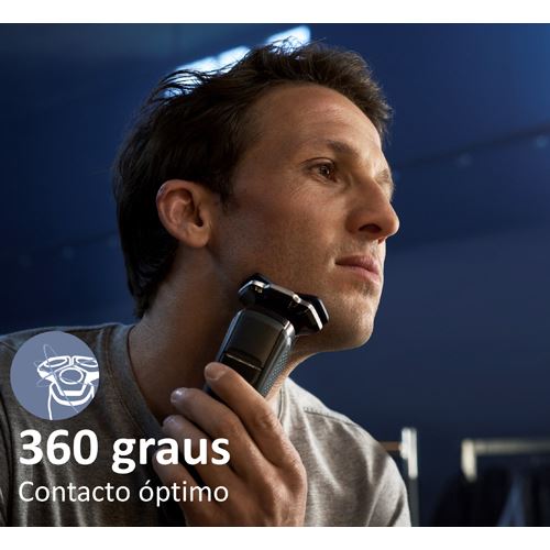 As cabeças totalmente flexíveis rodam a 360° para seguir os contornos faciais. Desfrute de um contacto perfeito com a pele para um barbear cuidado e confortável.