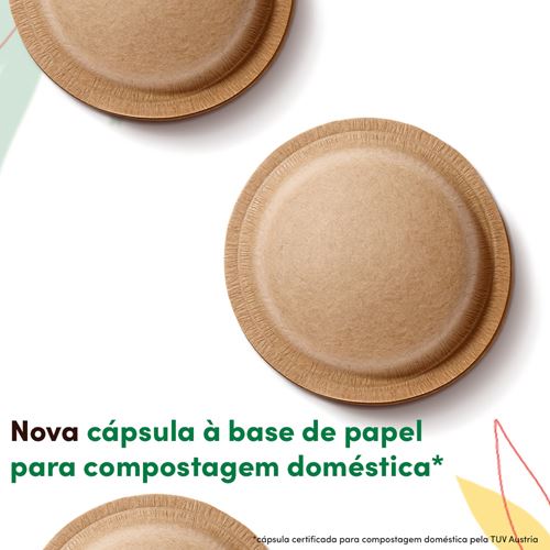 Cápsulas compostáveis, feitas em papel (dependendo de factores como humidade e temperatura, o papel da cápsula decompôr-se-á em 6 meses)