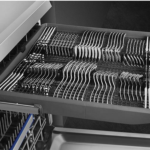Opção Esterilização | Suporte para copos | Comandos eletrónicos | Display Programação de início diferido | Indicação da duração do programa | Indicação do tempo para fim do programa | Luz indicadora falta de sal | Luz indicadora falta de abrilhantador | Sistema de secagem: Secagem por condensação natural, com Dry Assist, abertura automática da porta no final do ciclo