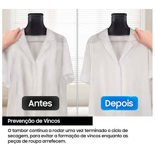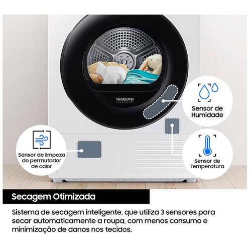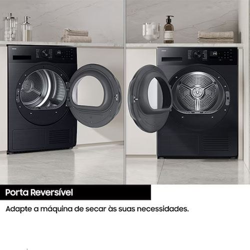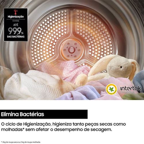 Para maior comodidade, dispõe de programa Hygiene Care, que elimina até 99,9% das bactérias, e conectividade SmartThings, permitindo controlo remoto e sugestões inteligentes. O design inclui porta reversível, filtro 2 em 1 e tambor com iluminação interna para facilitar o uso.