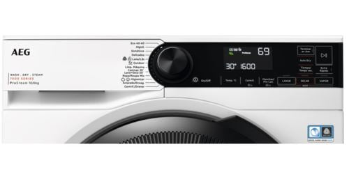 Máquina de lavar e secar roupa AEG da Série 7000 ProSteam com capacidade de 10 kg na lavagem e 6kg na secagem e 1.600 rpm, painel de controlo branco e porta preta, motor Inverter, programas a vapor ProSteam que reduzem vincos e refrescam os tecidos, tecnologia PreciseLoad que poupa tempo, água e energia