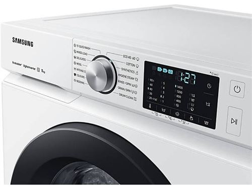 Máquina de lavar a roupa Samsung WW11BBA046AWEP, capacidade de carga de 11 kg, eficiência energética A. O seu consumo por ciclo de energia é de 0,53 kWh e de 54 litros de água estimados e velocidade de centrifugação de 1400 RPM.