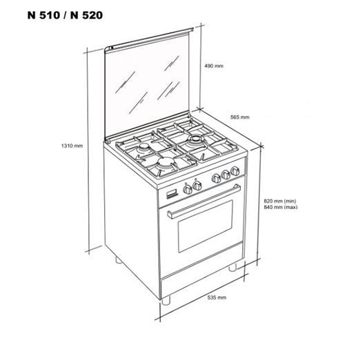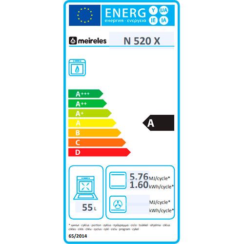 Fogão Meireles N 520 X da Meireles apresenta uma mesa de trabalho em aço inoxidável, quatro queimadores de alta eficiência e forno com capacidade útil de 55 litros, insere-se na classe de eficiência energética A. Os queimadores e o forno possuem válvulas de segurança que cortam o fluxo de gás quando a chama se extingue, garantindo a segurança do utilizador. Este fogão utiliza gás butano-propano.