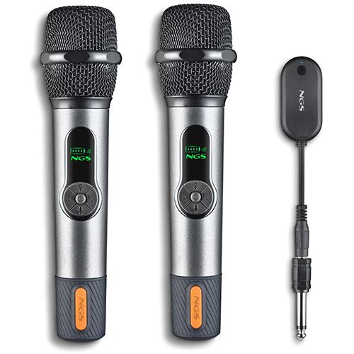 Conjunto de microfone sem fios com 2 microfones e recetor sem fios.