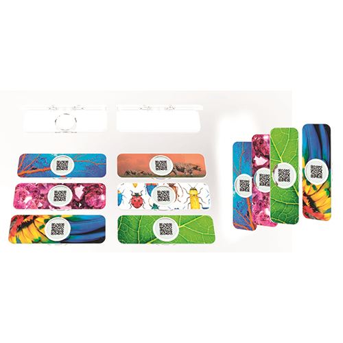 O kit inclui 6 lâminas digitais com código QR em ambos os lados, para um total de 12 tópicos a explorar com vídeos, fotos e questionários. Tem ainda 2 lâminas para criar amostras para personalizar.
