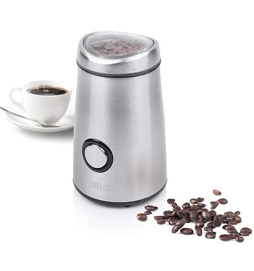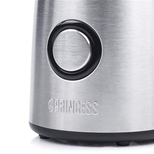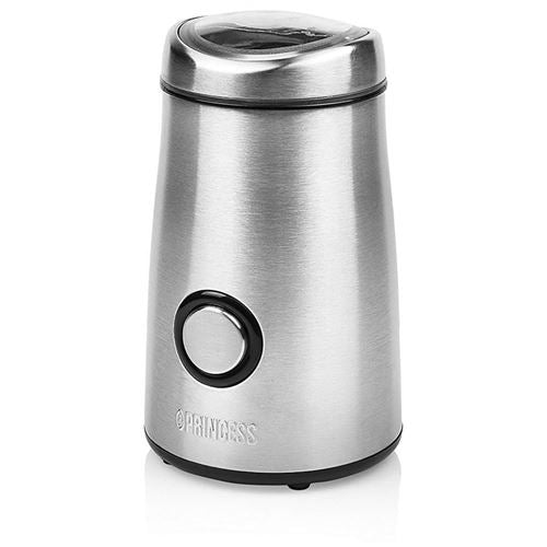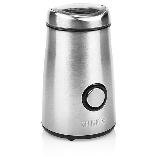 Moinho de café, em inox, da Princess. Desfruta da qualidade do café moído na hora, graças a este aparelho prático e durável. Lâminas e recipiente em aço inoxidável. Mói até 50 g de grãos de café. Potência máxima de 150 W.