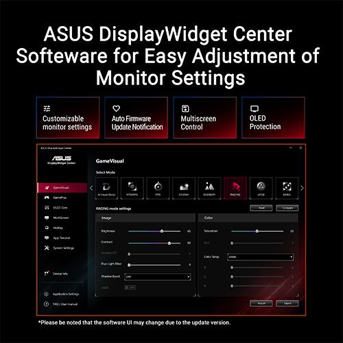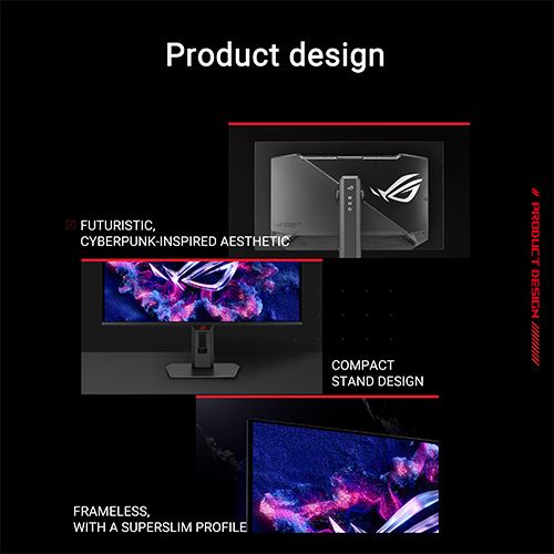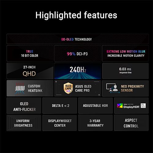Tempo de resposta GTG: 0,03 ms | Funcionalidades Gaming: GameVisual, GamePlus, Shadow Boost, Extreme Low Motion Blur | Proteção do Painel: ASUS OLED Care Pro, Neo Proximity Sensor, Pixel Refresh, Pixel Shift, Logo Brightness Adjustment | Proteção Ocular: TUV Flicker-free, TUV Low Blue Light | DisplayWidget Center | Ajustes: Soquete para tripé de 1/4, Inclinação: +20° -5°, Rotação horizontal: +45° -45°, Rotação vertical: +90° -90°, Ajuste de altura: 0 a 110 mm | Kensington Lock