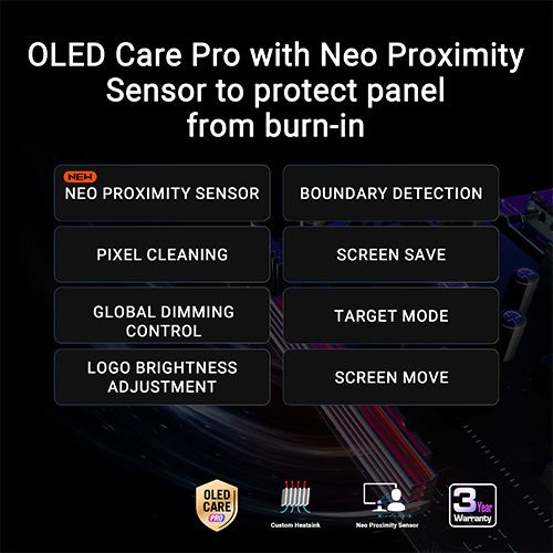 Pensada para durar, integra o sistema ASUS OLED Care Pro com sensor Neo Proximity — o ecrã desliga-se automaticamente quando te afastas, protegendo-o contra burn-in. A dissipação térmica foi optimizada através de um suporte especial.